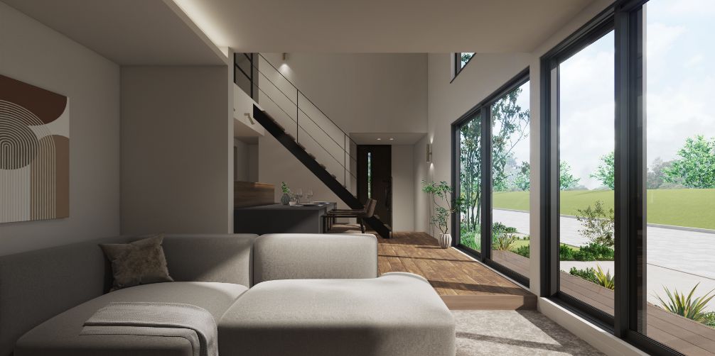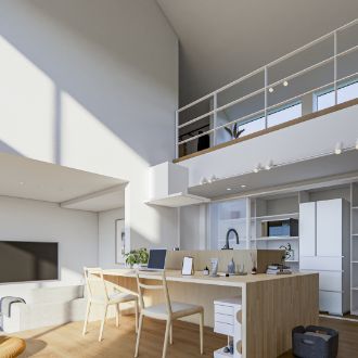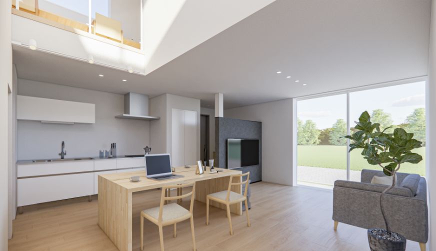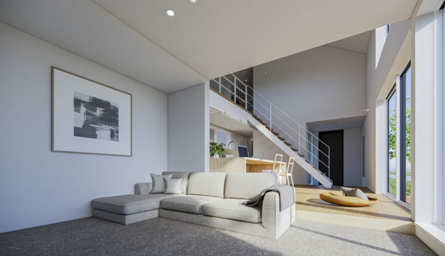 吹抜のある大空間で、開放感を感じながら居心地よく過ごすことができ、自然なつながりを感じられる空間。