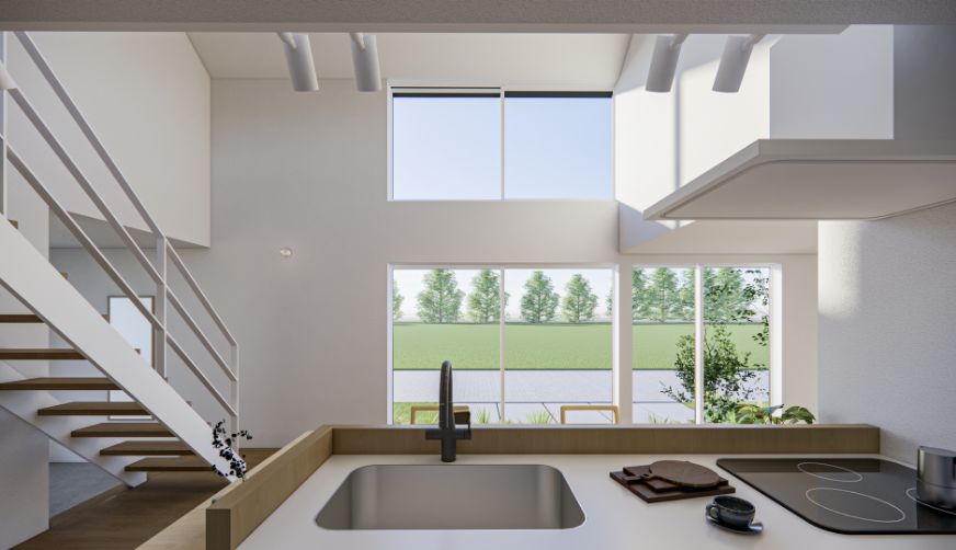 家の中心に機能的なキッチンを配置。眺めのよさと家事動線の良さを両立した空間に。