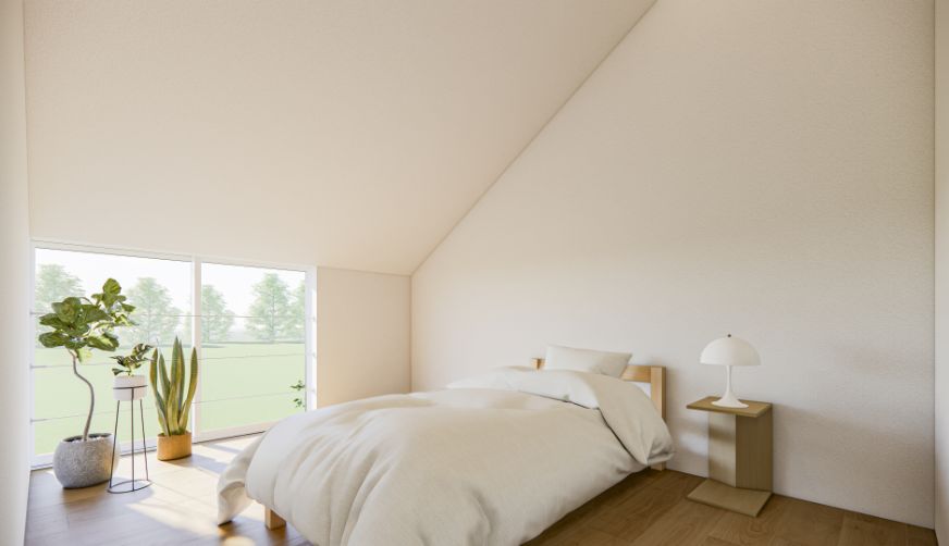 勾配天井がつくるやわらかな高低差が、落ち着きのある心地よさを生む寝室に。