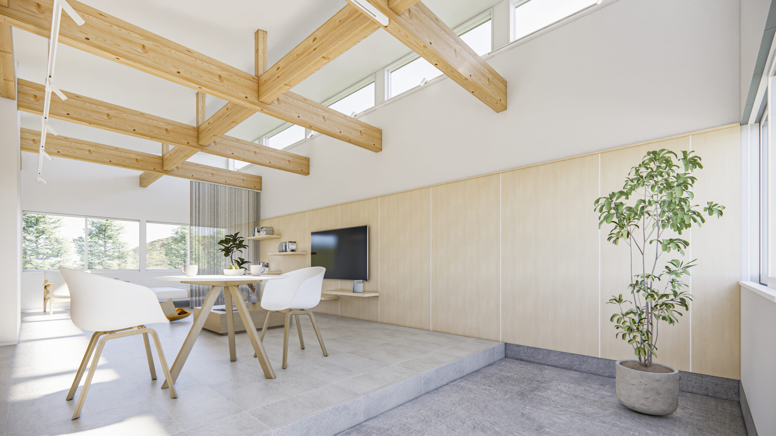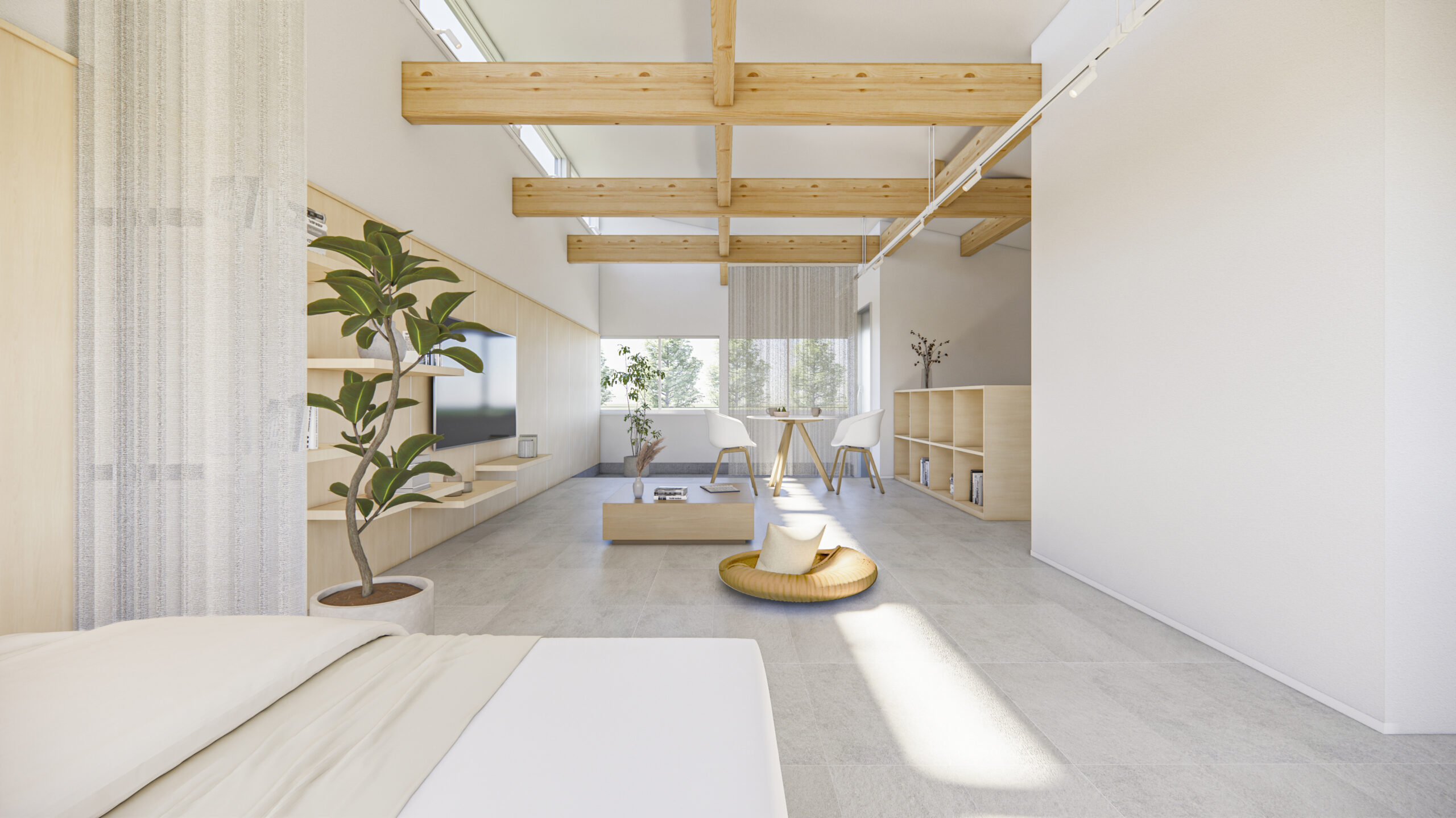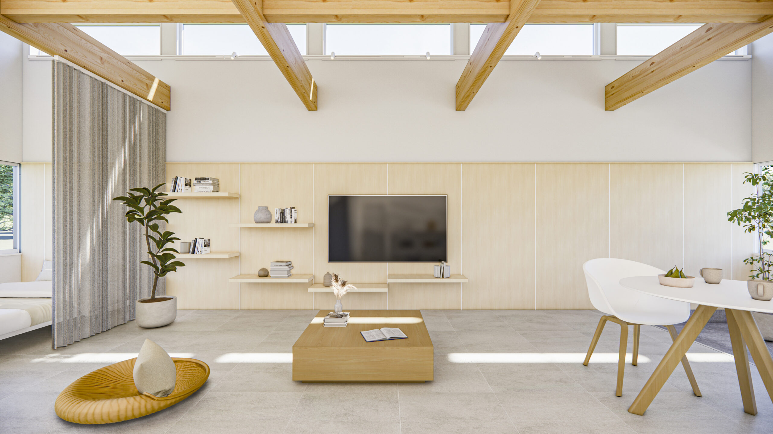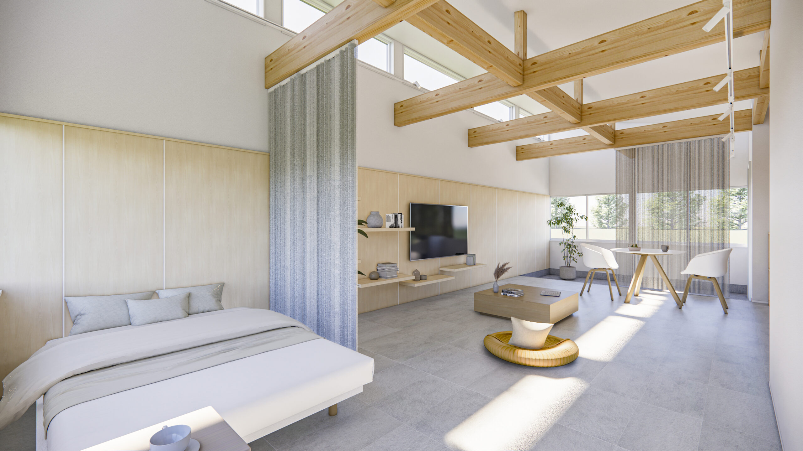 コンパクトな室内を無駄なく活かした、大きな空間。構造材や合板の壁を下地としたシンプルな内装が、手の加えやすさを生み、暮らしに合わせて更新しながら、自分らしい住まいへと育っていきます。