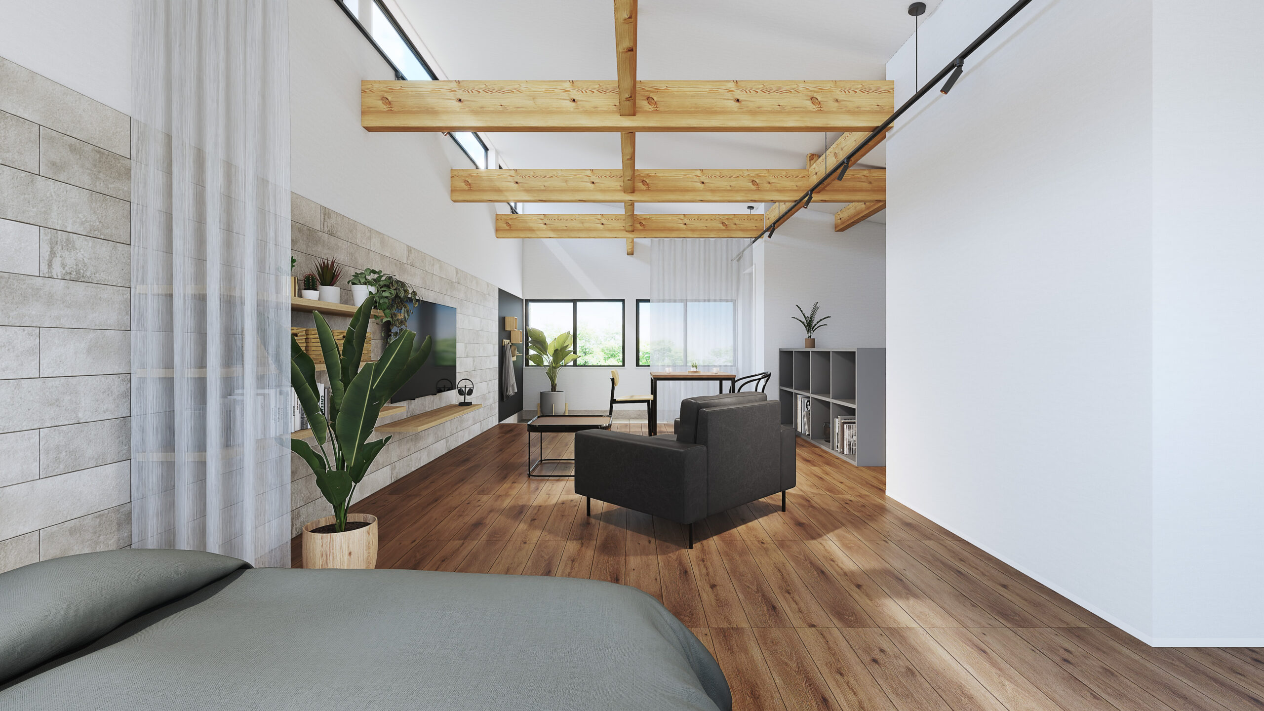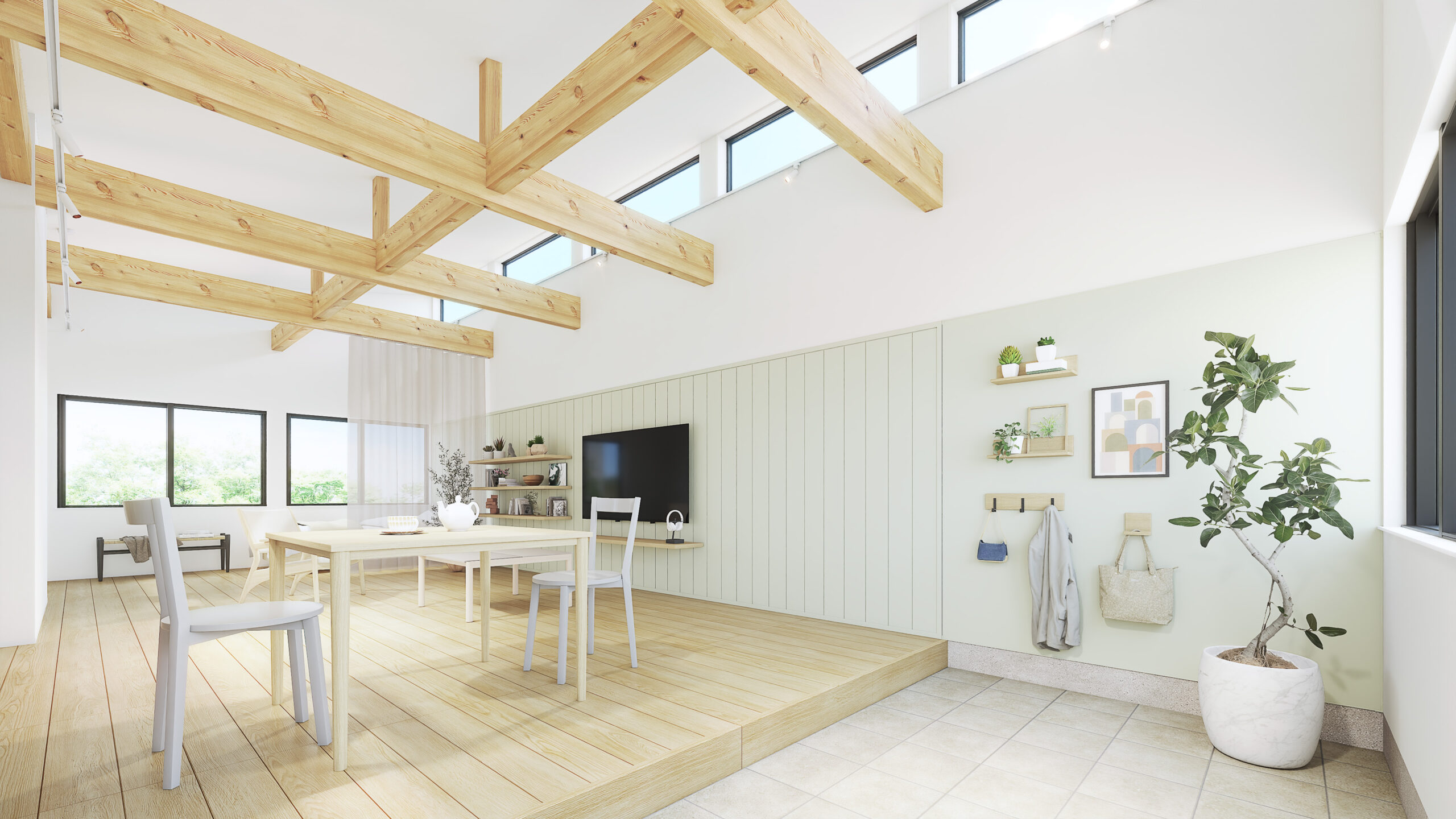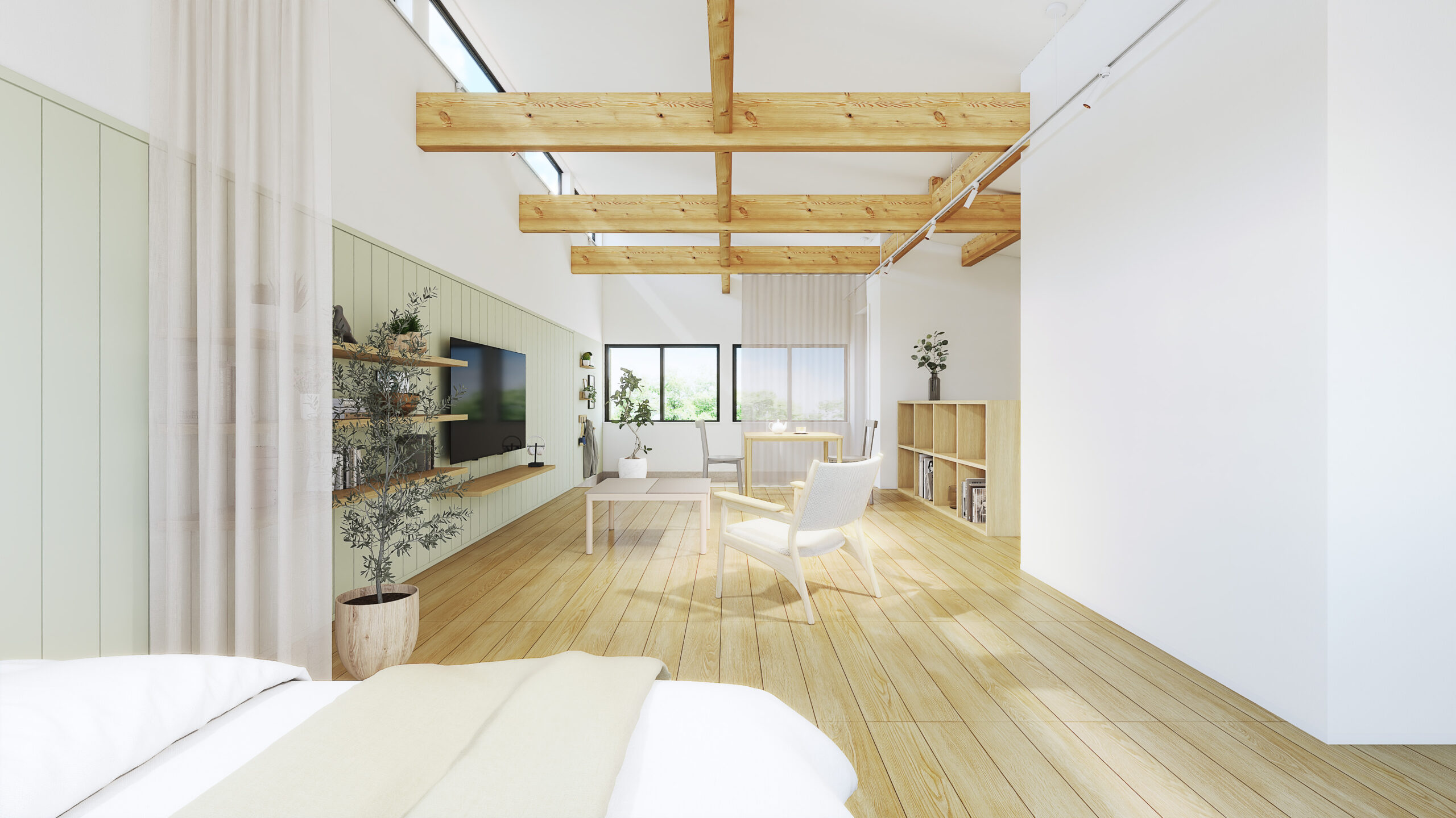 コンパクトな室内を無駄なく活かした、大きな空間。構造材や合板の壁を下地としたシンプルな内装が、手の加えやすさを生み、暮らしに合わせて更新しながら、自分らしい住まいへと育っていきます。
