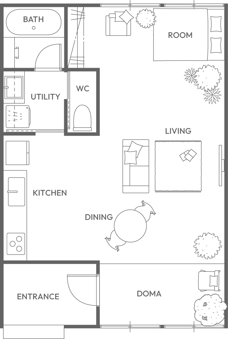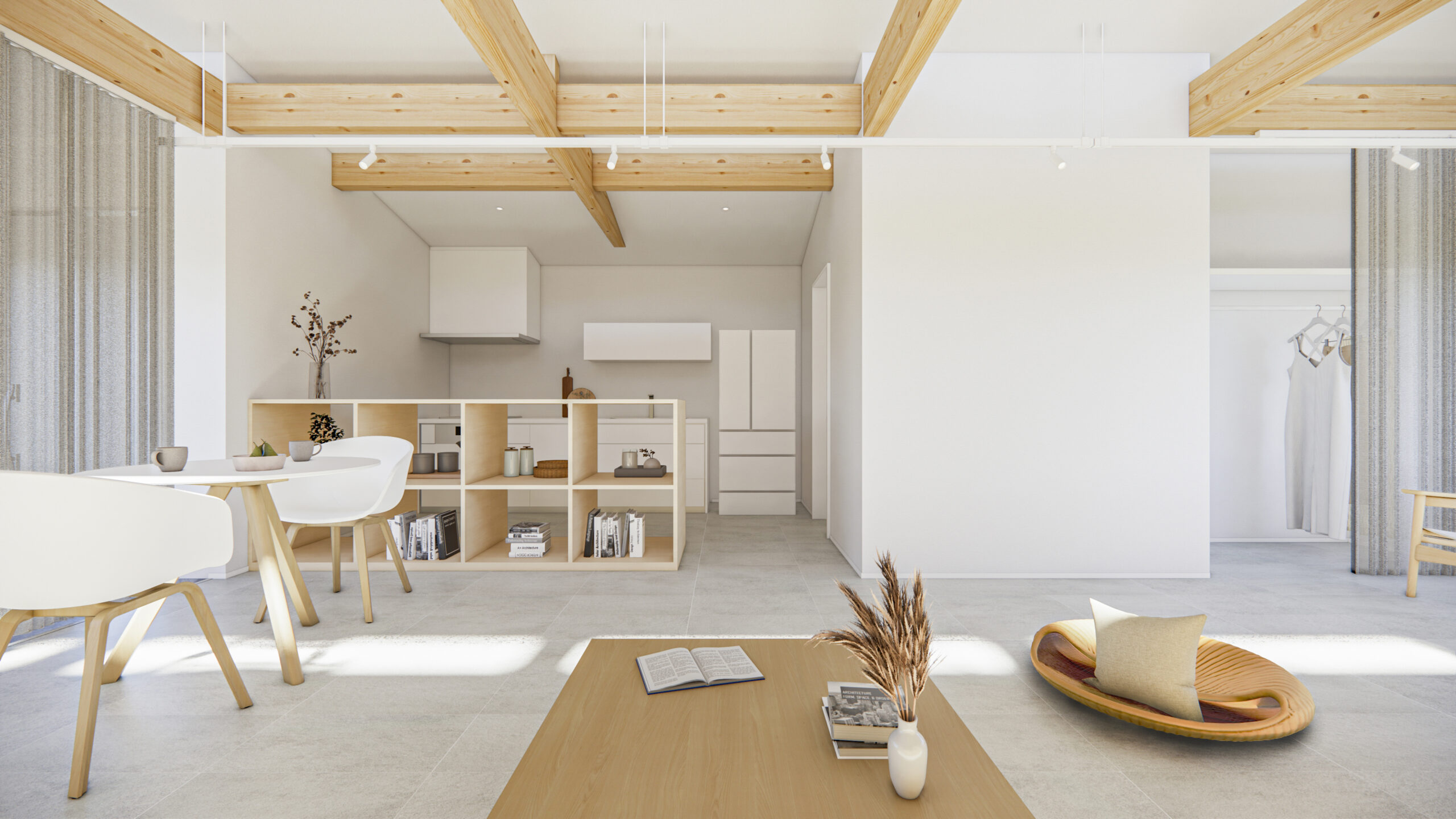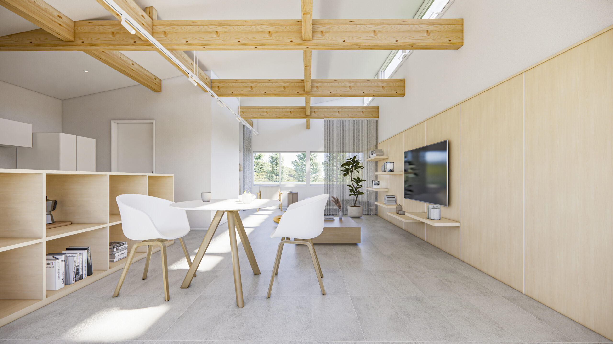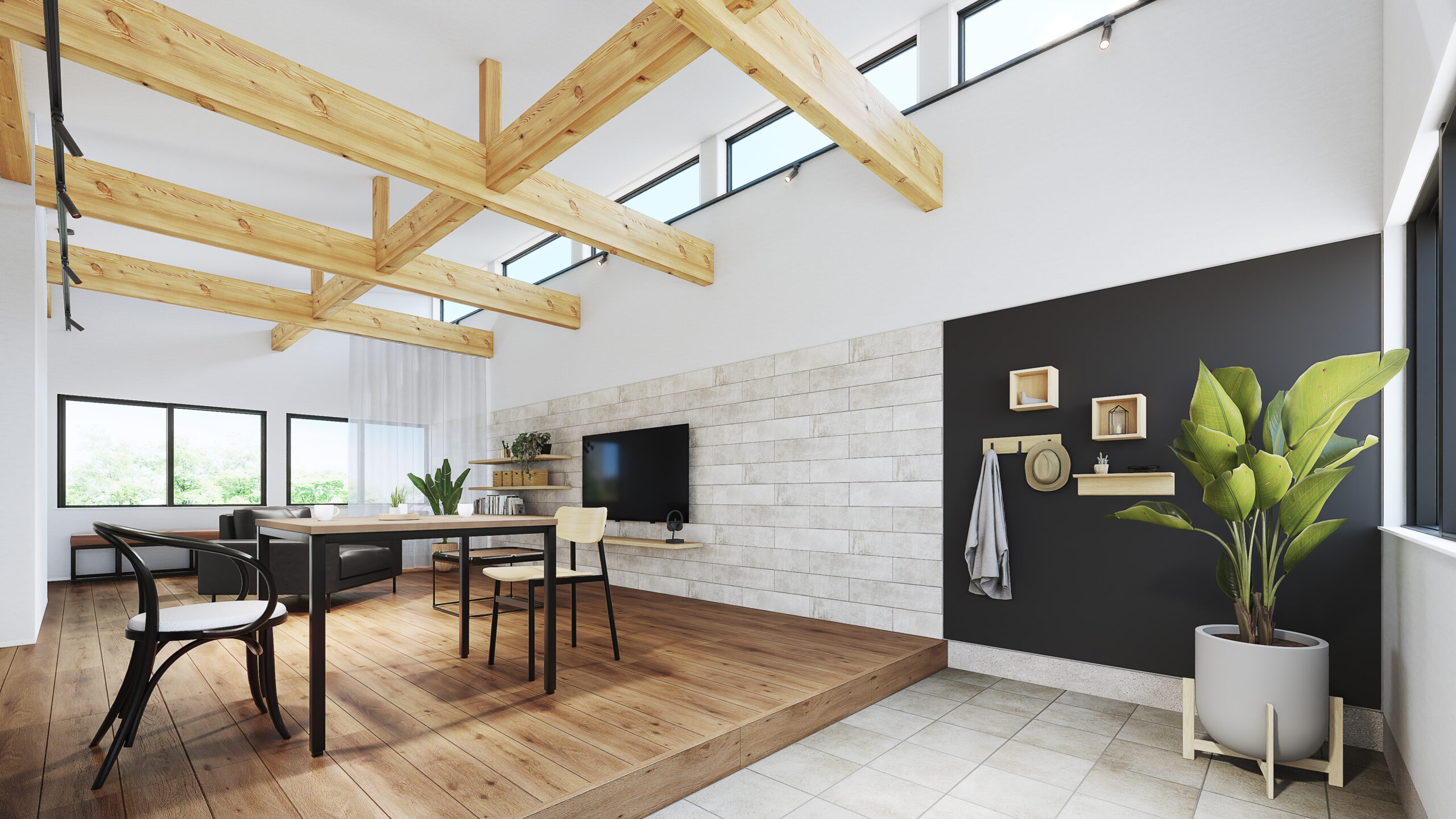 コンパクトな室内を無駄なく活かした、大きな空間。構造材や合板の壁を下地としたシンプルな内装が、手の加えやすさを生み、暮らしに合わせて更新しながら、自分らしい住まいへと育っていきます。